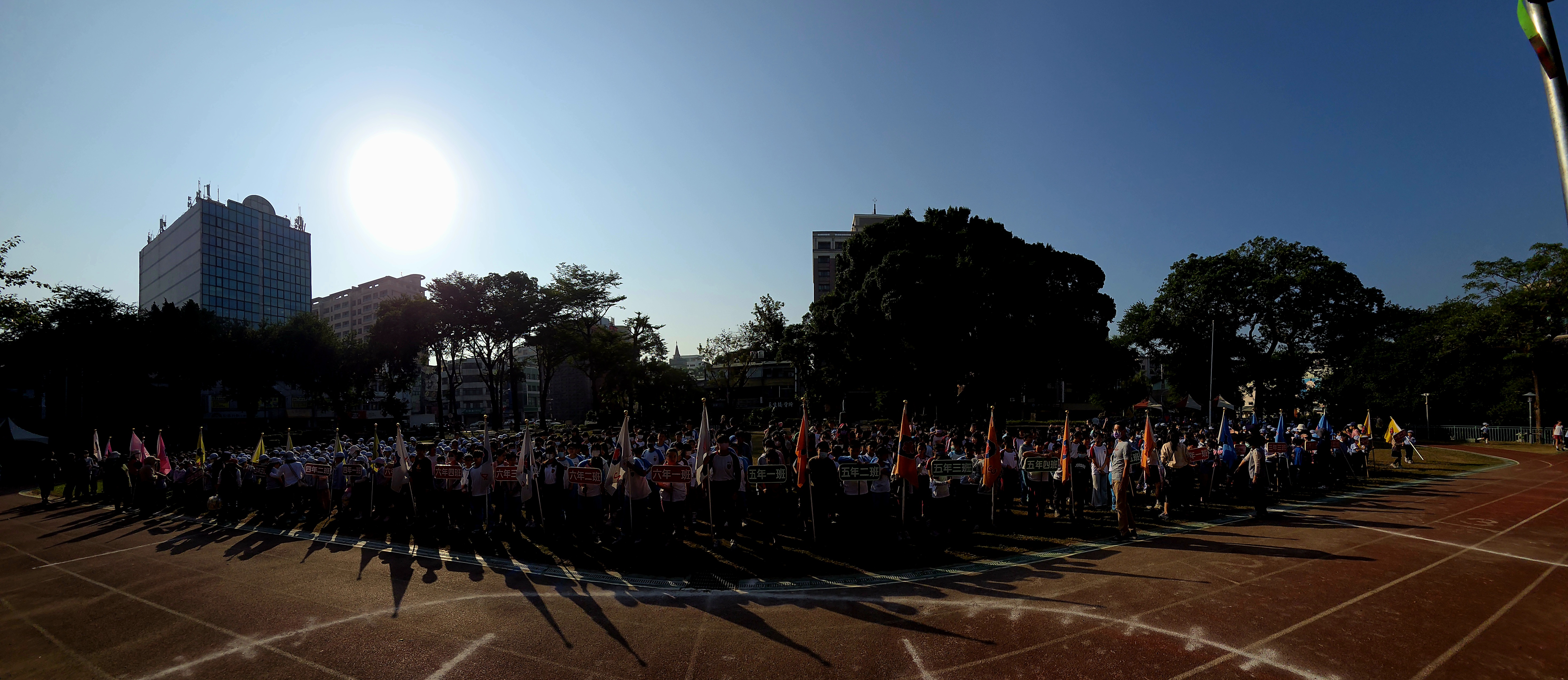 今天早天天氣晴朗,全校師生在外操場進行運動會的預演…